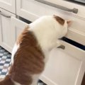 模様替えをする飼い主さんの邪魔をしている猫ちゃんに起きたハプニングとそのリアクションが面白いと話題になっています。