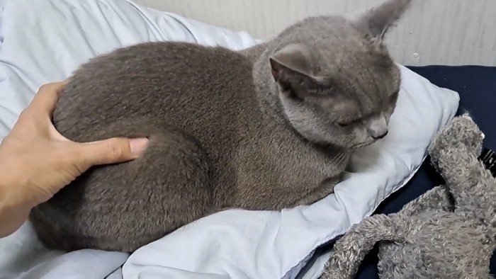 動画は、ロシアンブルーの「すずまろくん」がベッドの上でくつろいでいるシーンから始まります。すると飼い主さんはおもむろにすずまろくんのお尻に手を伸ばしてマッサージを開始。気持ちよさそうにしている姿が可愛いです。