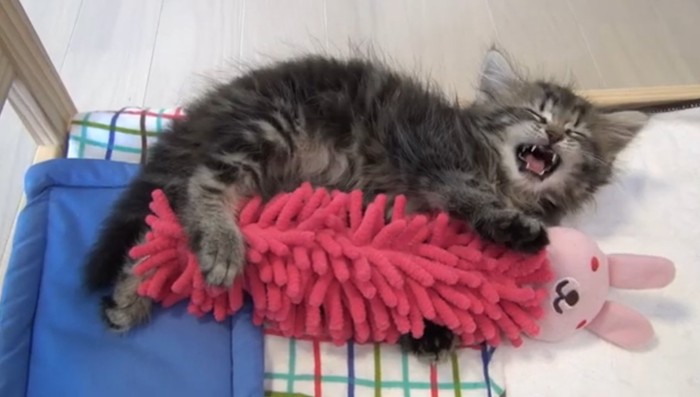 隣にある自分の体と同じくらいの大きさの人形に、くっついて眠っていたというおさむくん。穏やかな表情を浮かべながら、スヤスヤと眠っていたといいます。すると、「んにゃー!」とまるで叫ぶように鳴き声を上げたおさむくんが、目を覚ましたそうです。