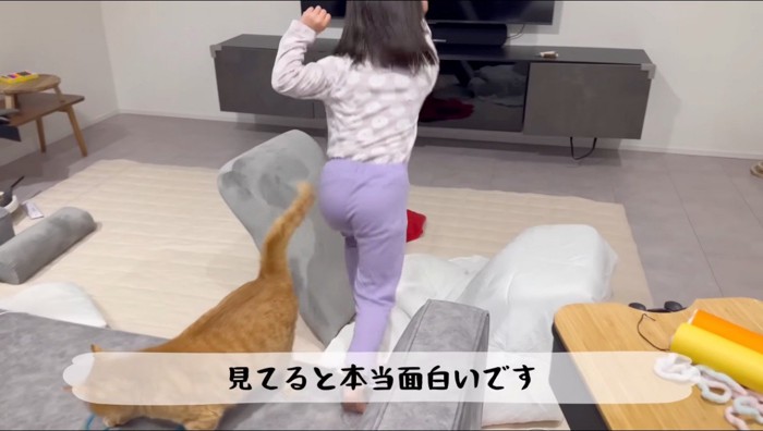 飼い主さんの娘は、遊びざかりの5歳の女の子。この日も、茶トラ猫のとらまる君と一緒に楽しく追いかけっこしていたといいます。娘ちゃんが逃げては、とらまる君が追いかける。そんな遊びをしばらく続けていたとのこと。