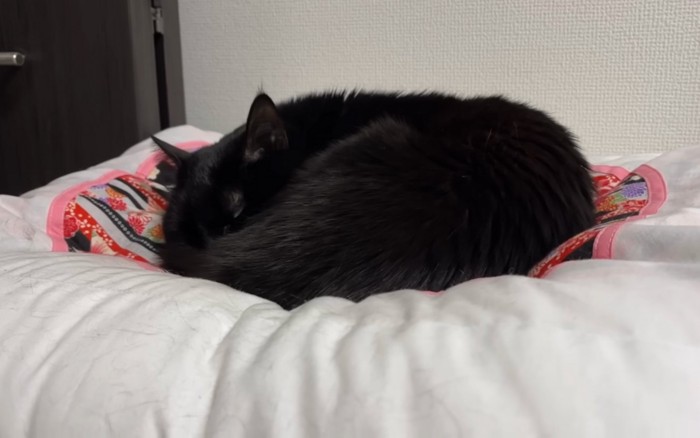 人間が使うお布団のようなベッドでうとうとするのは、元保護猫のほたねちゃん。すっぽりと掛け布団に包まれ、枕に顎を乗せる姿は人間そのもの。そのまますやすやと眠ってしまったんだとか。