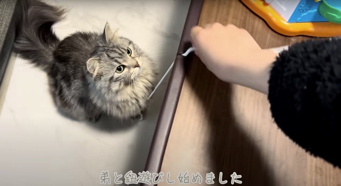 紐の先をたどっていくと、華ちゃんが前足の爪に紐を引っかけて、しっかりホールド。