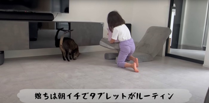 というのも、娘ちゃんは朝イチにタブレットを見るのがルーティンになっているのだとか。娘ちゃんはタブレットを見始めると、完全に集中モードに入るため、ももまるちゃんがどれだけ構ってアピールをしても構ってもらえないそうです。