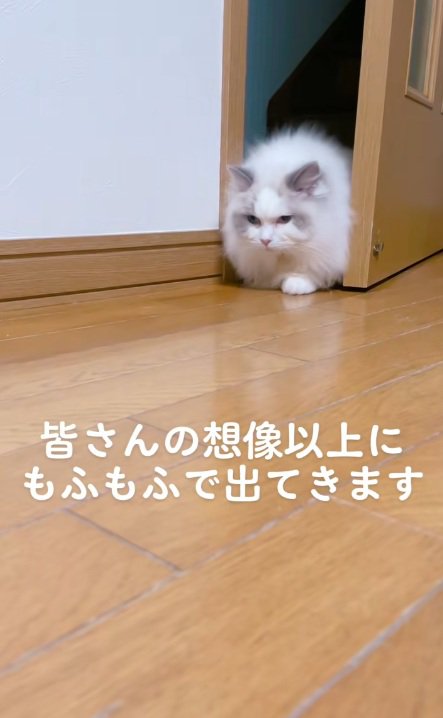 猫ちゃんがドアから出てくると…顔が小さく見えるほどふわふわの体が!長毛で手触りの良い毛並みが特長のラグドールですが、こんなにもふもふの子は珍しいのではないでしょうか。