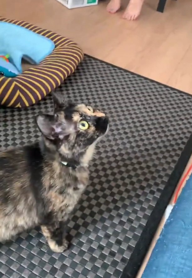 飼い主さんが名前を呼ぶと、くるっと振り返って飼い主さんを見つめるサビ猫ちゃん。そして可愛すぎる声で、お利口さんにお返事をしてくれたといいます。