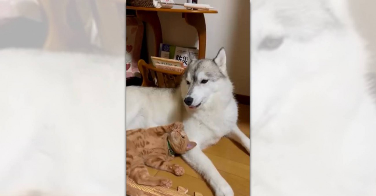 お昼寝風景がラブラブ過ぎてなんとも羨ましいこちらはシベリアンハスキーのユキちゃんとキジトラのサンちゃん。お顔とお顔をぴったりと寄せ相思相愛なのが伝わってきます。