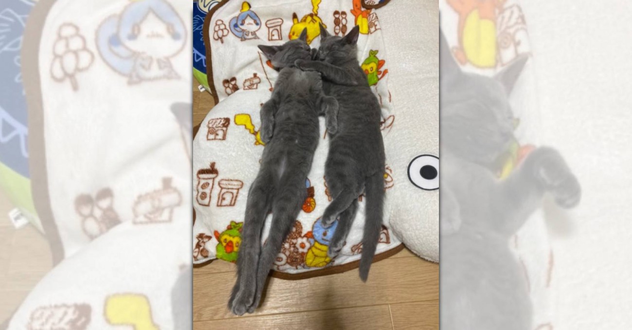 仲良く寄り添うこちらの2匹はカイ君とグリ君。約1か月の頃に2匹一緒に飼い主さん宅に迎えられました。小さな頃からいつも身を寄せ合い、お互いの体温を感じながら寝ていたカイ君とグリ君は大きくなった今も寝落ち方が当時のままなのだとか。