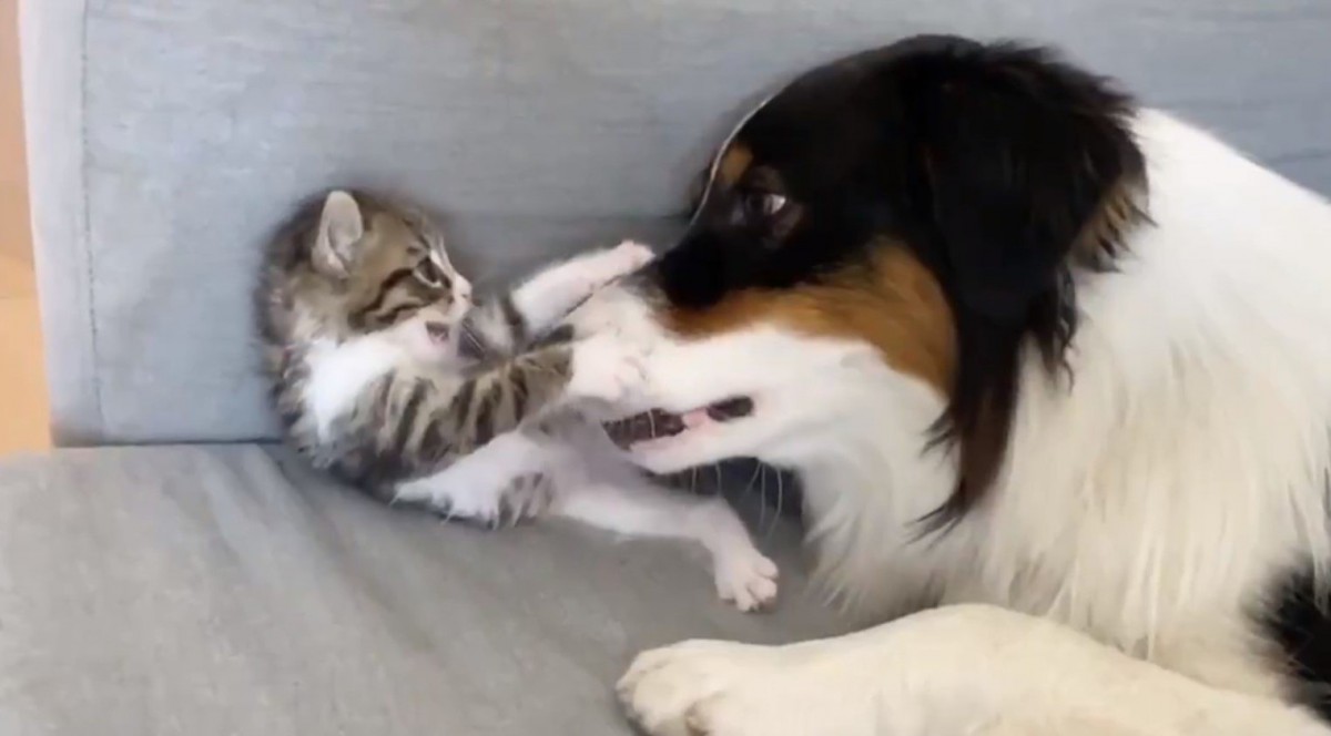 よちよちの子猫VS育児にいそしむ大きなパピーの可愛すぎる戦いが話題 | ねこちゃんホンポ